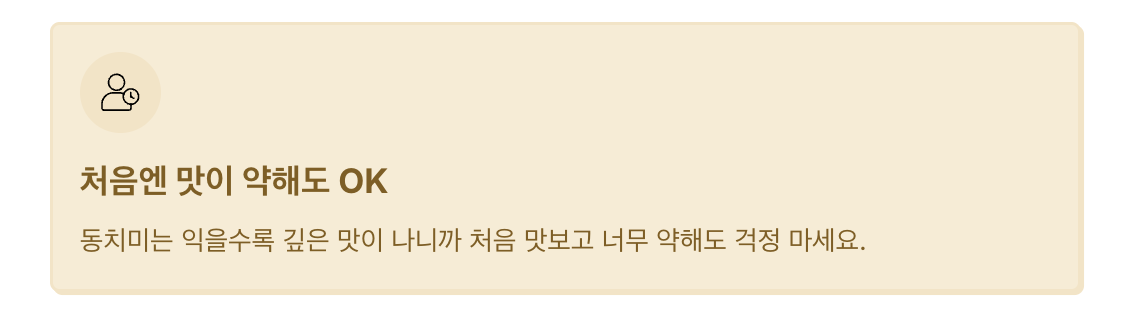 동치미는 익을수록 깊은 맛이 나니까 처음 맛보고 너무 약해도 걱정 마세요.