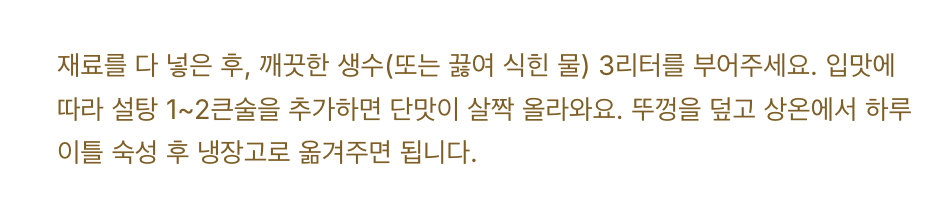 재료를 다 넣은 후, 깨끗한 생수(또는 끓여 식힌 물) 3리터를 부어주세요.