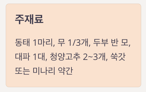 | 주재료 | 동태 1마리, 무 1/3개, 두부 반 모, 대파 1대, 청양고추 2~3개, 쑥갓 또는 미나리 약간 |