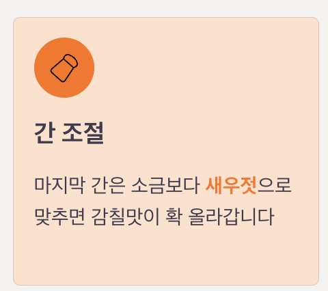 | 간 조절 | 마지막 간은 소금보다 새우젓으로 맞추면 감칠맛이 확 올라갑니다 |