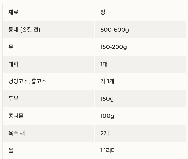 동태탕 황금레시피 요약표