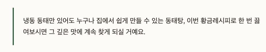 추워진 날씨, 칼바람 맞고 돌아온 저녁에 따끈한 국물요리만큼 든든한 한 끼가 또 있을까요? 그중에서도 동태탕은 담백하면서도 칼칼한 국물 맛이 매력적인 대표 겨울 찌개인데요. 오늘은 냉동 동태를 사용해도 비린내 없이 깔끔하고 진하게 끓일 수 있는 동태탕 황금레시피를 소개해드릴게요. 제대로 손질하고 제대로 양념하면 식당 부럽지 않은 깊은 맛을 낼 수 있답니다.