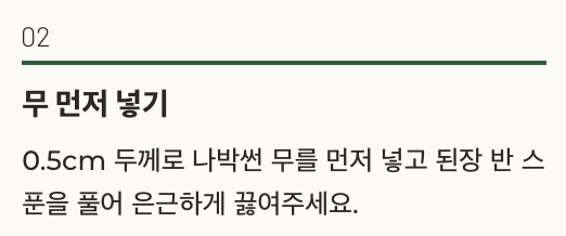 여기에 0.5cm 두께로 나박 썬 무를 먼저 넣고 된장 반 스푼을 풀어 은근하게 끓여주세요.