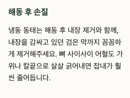 냉동 동태는 해동 후 내장 제거와 함께, 내장을 감싸고 있던 검은 막까지 꼼꼼하게 제거해 주세요.