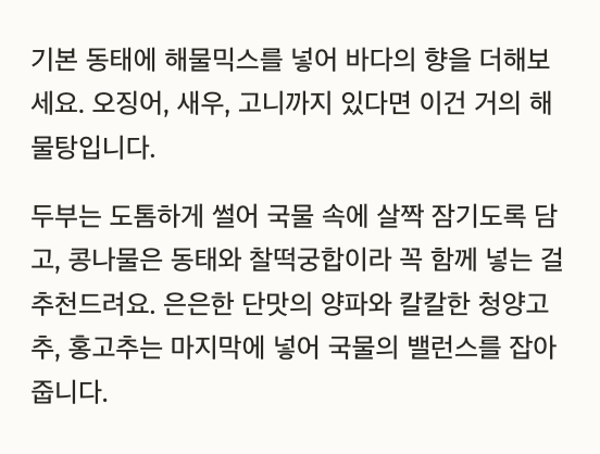 기본 동태에 해물믹스를 넣어 바다의 향을 더해보세요.