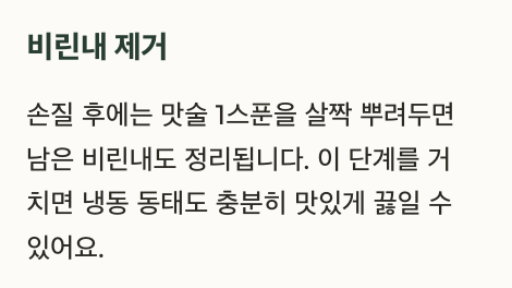 손질 후에는 맛술 1스푼을 살짝 뿌려두면 남은 비린내도 정리됩니다.
