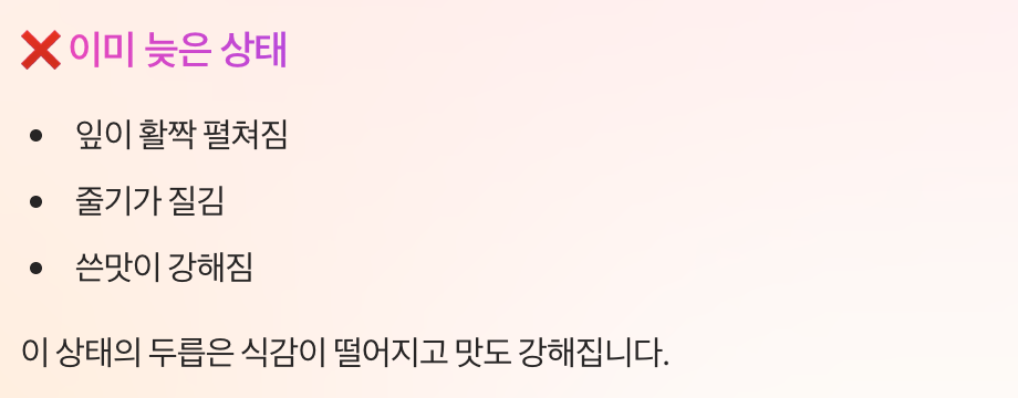 채취 시기를 놓치면 맛과 식감이 크게 떨어지기 때문에 정확한 시기를 아는 것이 중요합니다.