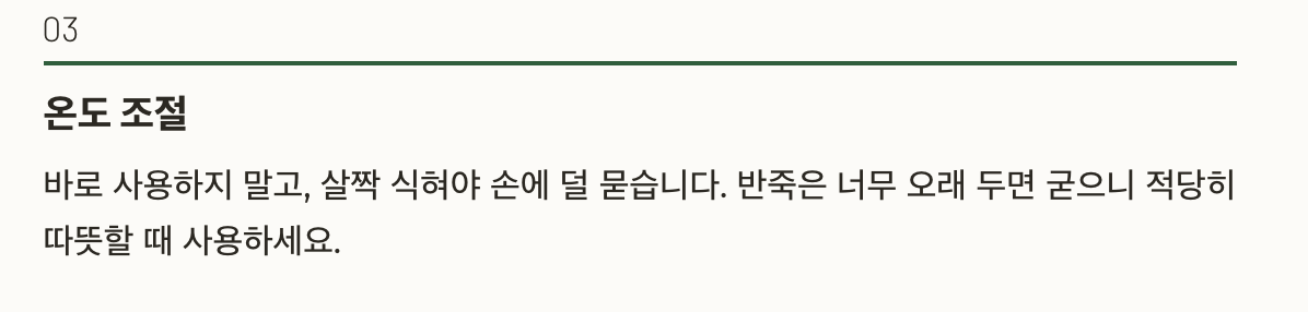 바로 사용하지 말고, 살짝 식혀야 손에 덜 묻어요.