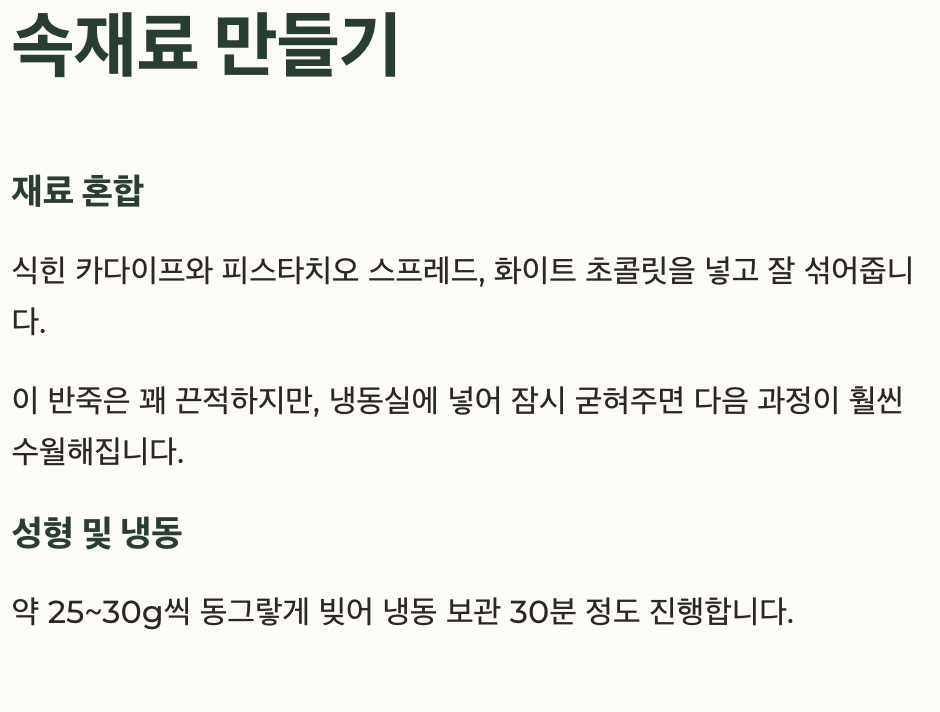 | 카다이프 상태 | 충분히 식혀야 스프레드와 잘 섞여요 |
