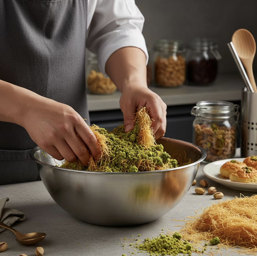 속은 바삭한 카다이프와 진한 피스타치오 스프레드로 채워진
