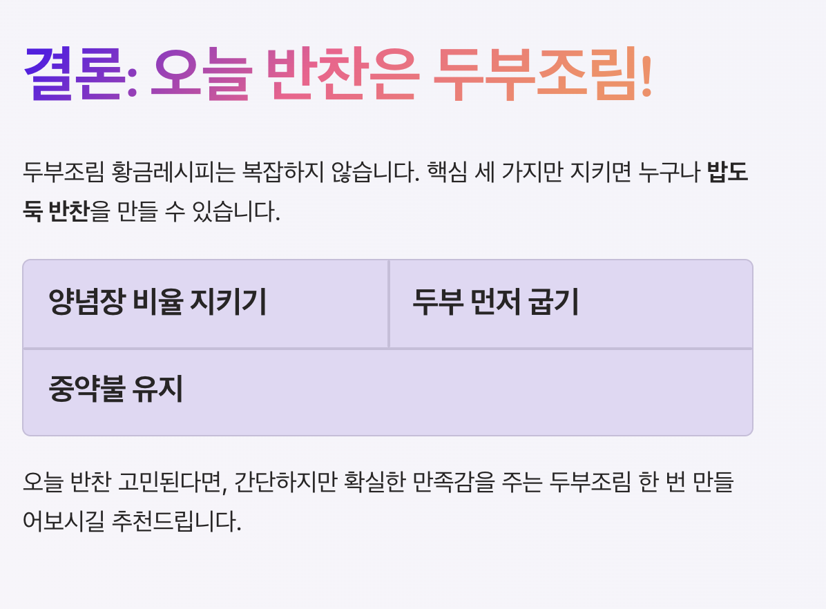 이번 글에서는 두부조림 황금레시피 핵심 비율, 만드는 방법, 실패 없는 팁까지 완벽하게 정리해드리겠습니다.