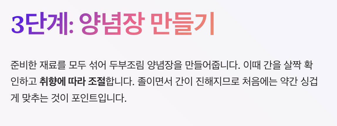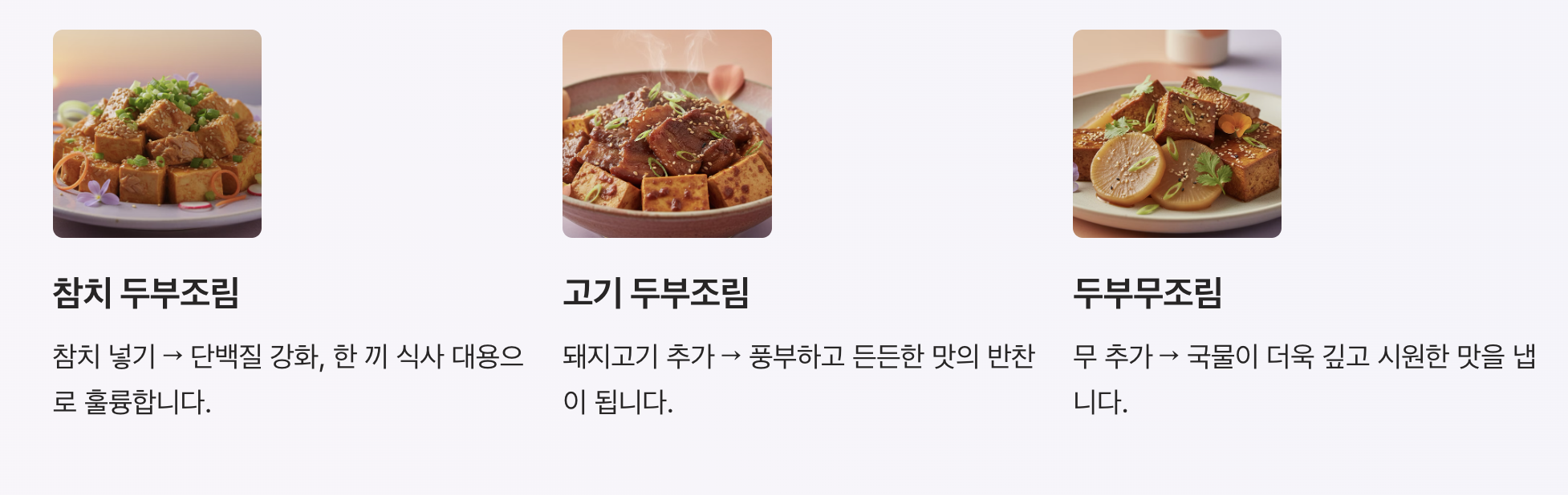 | 매콤 두부조림 | 고추장, 고춧가루 사용 | 매운맛 좋아하는 경우 |