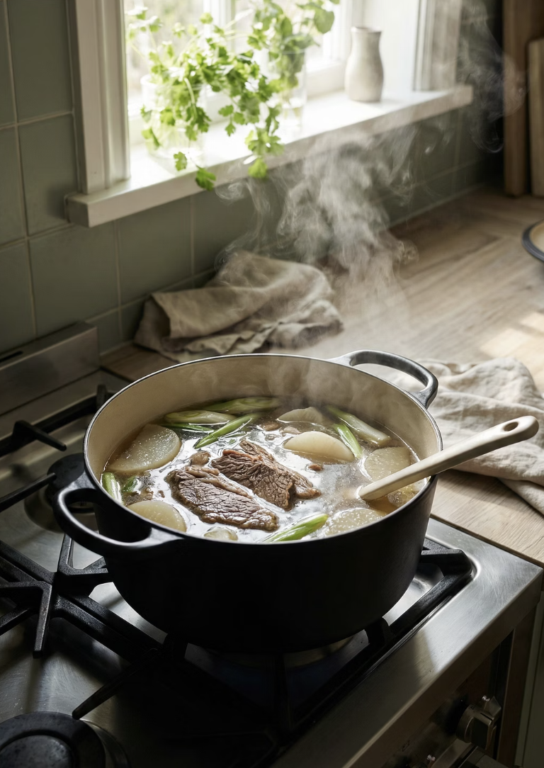 이 과정에서 고기의 감칠맛이 국물로 우러나 깊은 풍미를 만들어줍니다.