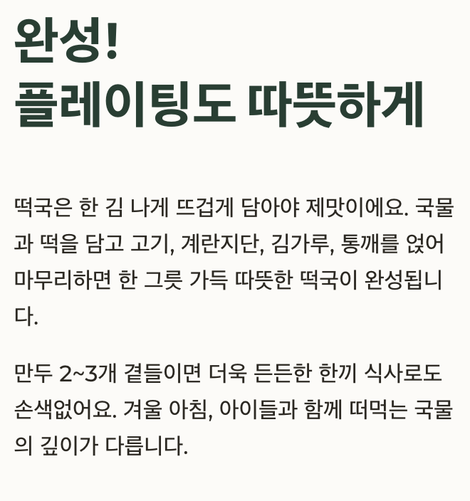 떡국은 한 김 나게 뜨겁게 담아야 제맛이에요.