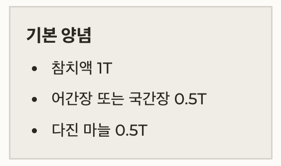 | 참치액 또는 어간장 | 0.5~1T | 간 맞춤 |