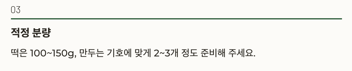 떡은 100~150g, 만두는 기호에 맞게 2~3개 정도 준비해 주세요.