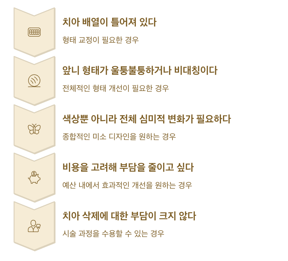 치아 삭제 여부, 통증 민감도, 색상 개선 목표, 비용, 내구성 등 여러 요소를 고려해 전문의와 충분히 상담 후 결정하는 것이 가장 현명한 선택입니다.