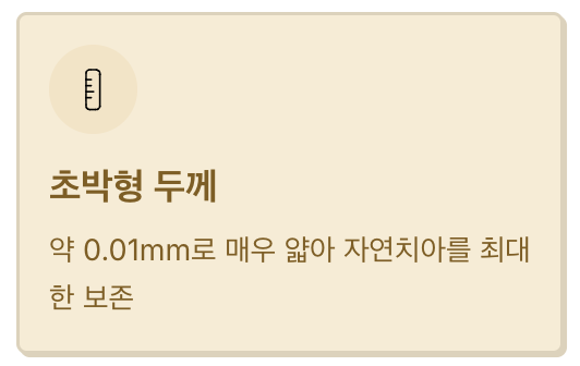 두께가 약 0.01mm로 매우 얇아 자연치아를 최대한 보존하면서 세라믹을 덧붙일 수 있는 방식이며, 스위스 기술 기반으로 100% 수제작됩니다.