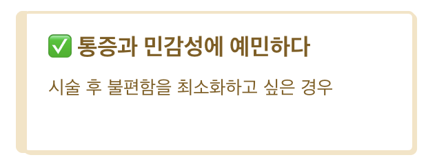 | 시술 통증 | 시림, 민감성 발생 가능 | 통증 거의 없음 |