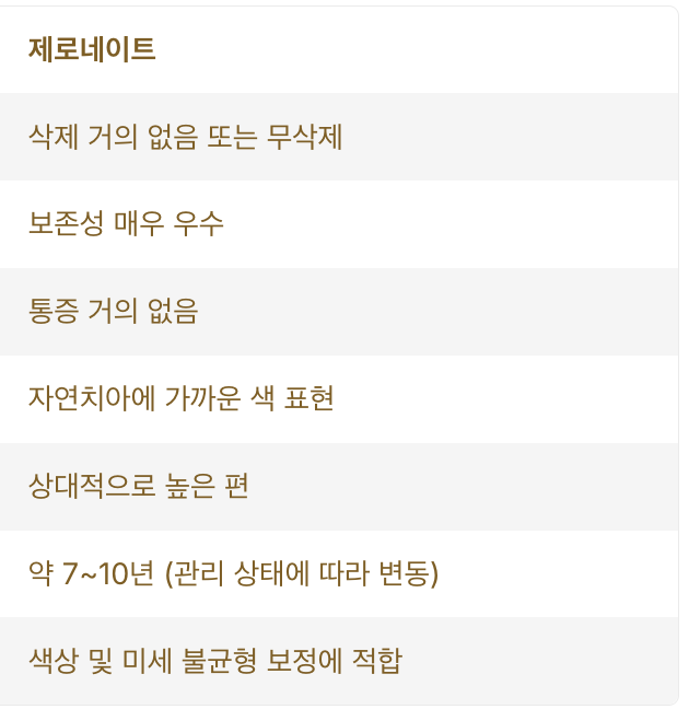 | 심미성 | 밝고 고른 인공미 느낌 | 자연치아에 가까운 색 표현 |