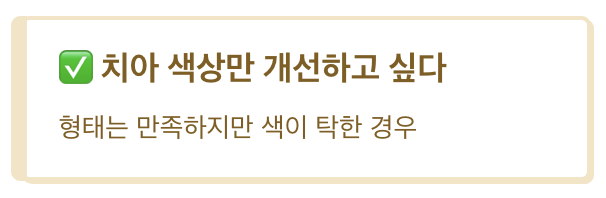 치아 삭제 여부, 통증 민감도, 색상 개선 목표, 비용, 내구성 등 여러 요소를 고려해 전문의와 충분히 상담 후 결정하는 것이 가장 현명한 선택입니다.