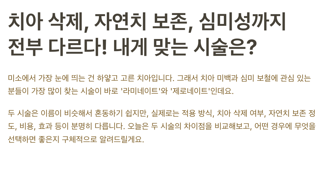 미소에서 가장 눈에 띄는 건 하얗고 고른 치아입니다. 그래서 치아 미백과 심미 보철에 관심 있는 분들이 가장 많이 찾는 시술이 바로 ‘라미네이트’와 ‘제로네이트’인데요. 두 시술은 이름이 비슷해서 혼동하기 쉽지만, 실제로는 적용 방식, 치아 삭제 여부, 자연치 보존 정도, 비용, 효과 등이 분명히 다릅니다. 오늘은 두 시술의 차이점을 비교해보고, 어떤 경우에 무엇을 선택하면 좋은지 구체적으로 알려드릴게요.