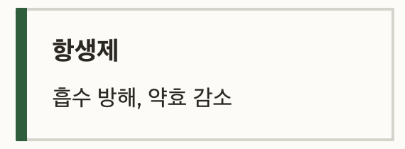 | 항생제 | 흡수 방해, 약효 감소 |