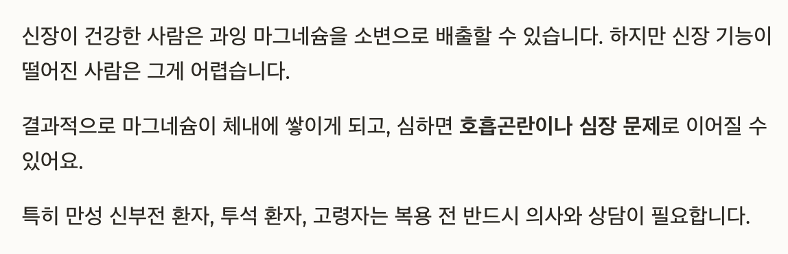 드물지만 마그네슘을 과다 섭취하거나, 배설 기능이 떨어진 상태에서 장기간 복용하면 심각한 문제가 생길 수 있습니다.