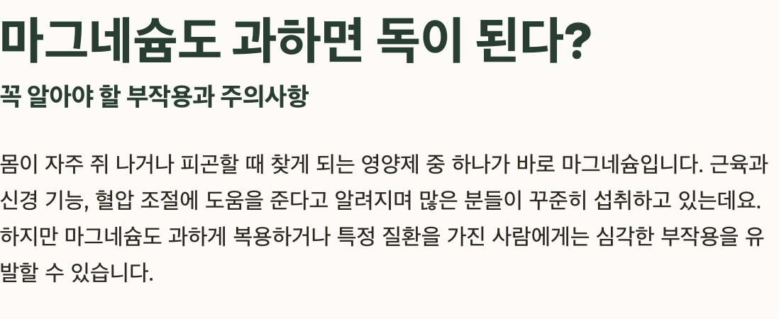 드물지만 마그네슘을 과다 섭취하거나, 배설 기능이 떨어진 상태에서 장기간 복용하면 심각한 문제가 생길 수 있습니다.
