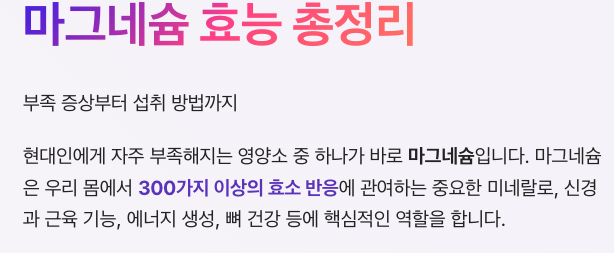 마그네슘은 우리 몸에서 매우 중요한 역할을 하는 필수 미네랄입니다. 특히 근육 이완, 신경 안정, 수면 개선, 피로 완화 등 다양한 마그네슘 효능이 알려져 있어 현대인에게 더욱 필요한 영양소입니다.
