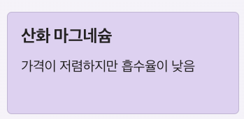 반면 산화 마그네슘은 가격은 저렴하지만 흡수율이 상대적으로 낮은 편입니다.