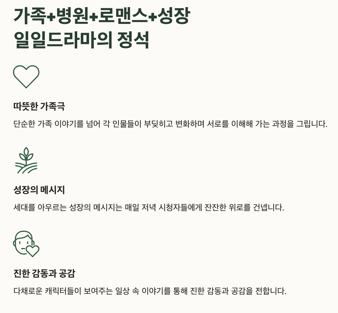 다채로운 캐릭터들이 보여주는 일상 속 이야기, 그리고 세대를 아우르는 성장의 메시지는 매일 저녁 시청자들에게 잔잔한 위로를 건넵니다.