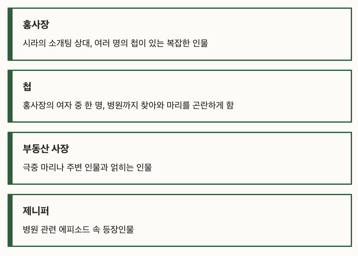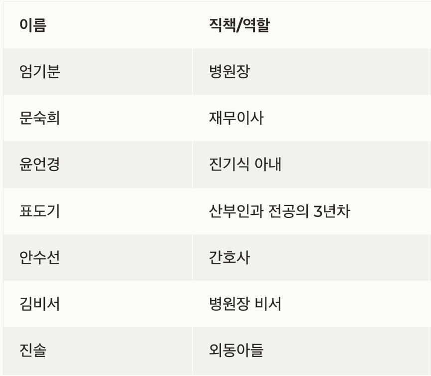 | 김비서 | 병원장 비서 | 소소하지만 중요한 연결고리 역할 |