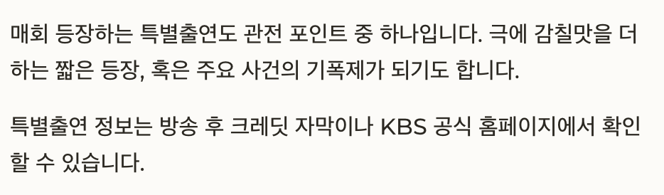 매회 등장하는 특별출연도 관전 포인트 중 하나입니다. 극에 감칠맛을 더하는 짧은 등장, 혹은 주요 사건의 기폭제가 되기도 해요. 특별출연 정보는 방송 후 크레딧 자막이나 KBS 공식 홈페이지에서 확인할 수 있습니다.