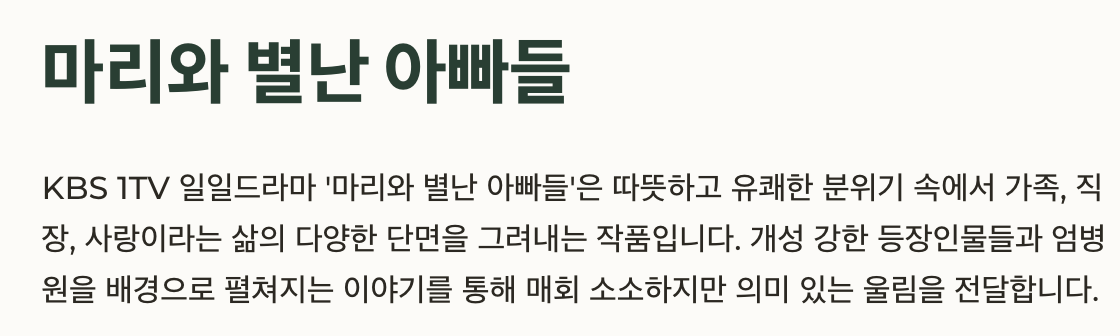 ‘마리와 별난 아빠들’은 단순히 따뜻한 가족극이 아닙니다. 각 인물들이 부딪히고 변화하며 서로를 이해해 가는 과정을 통해 진한 감동과 공감을 전하고 있죠.