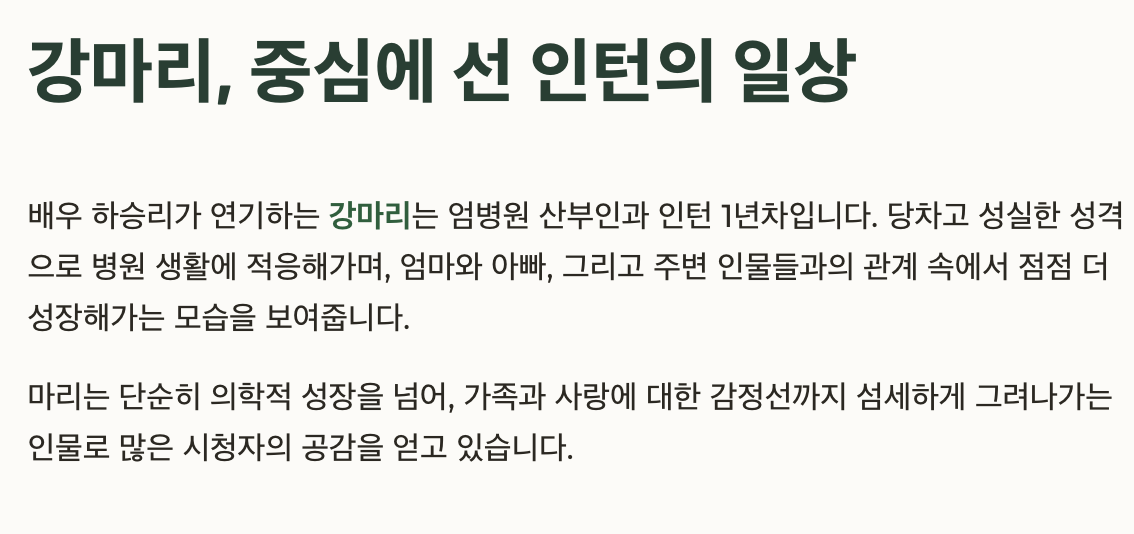 배우 하승리가 연기하는 ‘강마리’는 엄병원 산부인과 인턴 1년차입니다. 당차고 성실한 성격으로 병원 생활에 적응해가며, 엄마와 아빠, 그리고 주변 인물들과의 관계 속에서 점점 더 성장해가는 모습을 보여줍니다. 마리는 단순히 의학적 성장을 넘어, 가족과 사랑에 대한 감정선까지 섬세하게 그려나가는 인물로 많은 시청자의 공감을 얻고 있어요.