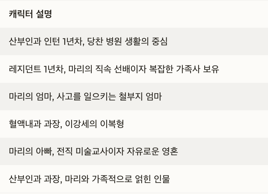 | 강마리 | 하승리 | 산부인과 인턴 1년차, 당찬 병원 생활의 중심 |