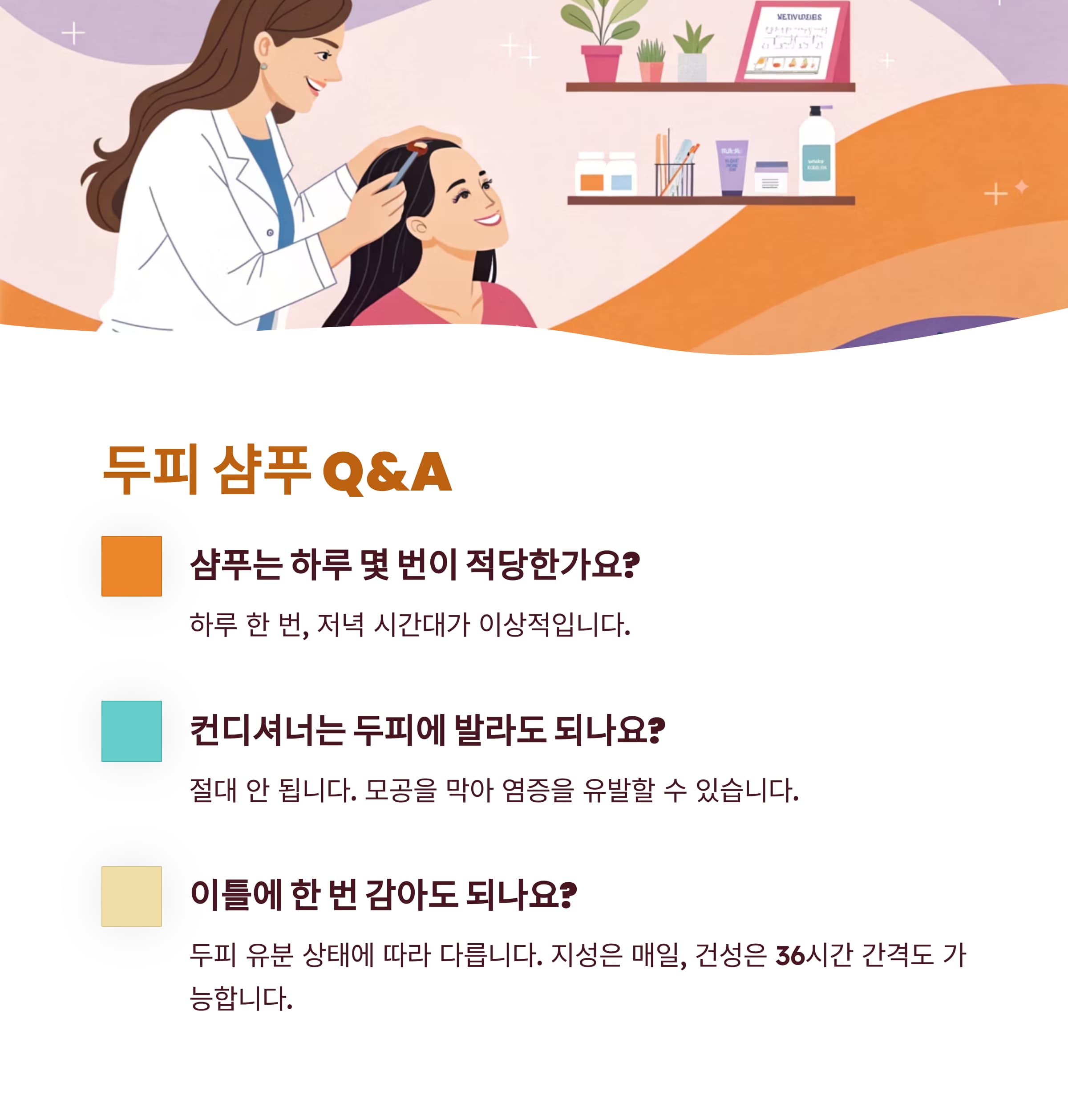 | 하루 두 번 이상 샴푸 | 피지 보호막 손실, 건조 유발 |