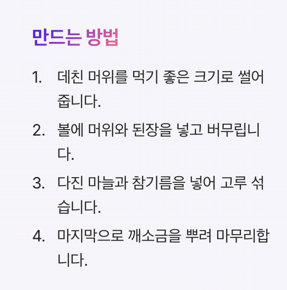 | 혼합 양념 | 된장+고추장 | 깊고 진한 맛 | 별미 |