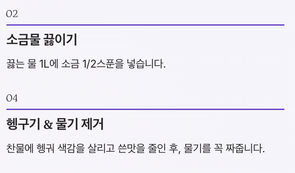- 찬물에 헹궈 색감을 살리고 쓴맛을 줄입니다.