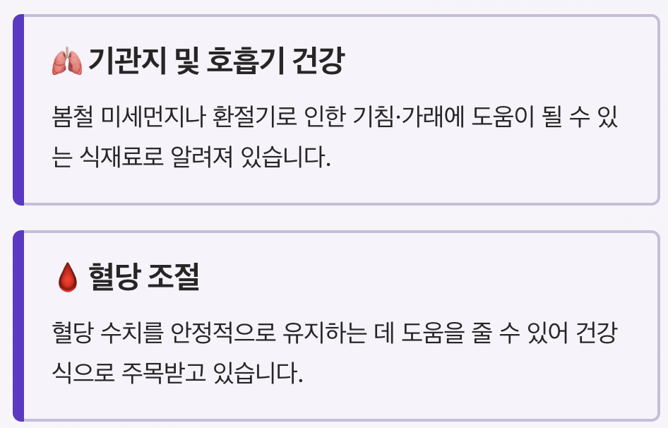 머위는 기관지 건강에 좋은 식재료로 알려져 있습니다. 봄철 미세먼지나 환절기로 인해 기침이나 가래가 생길 때 도움이 될 수 있습니다.