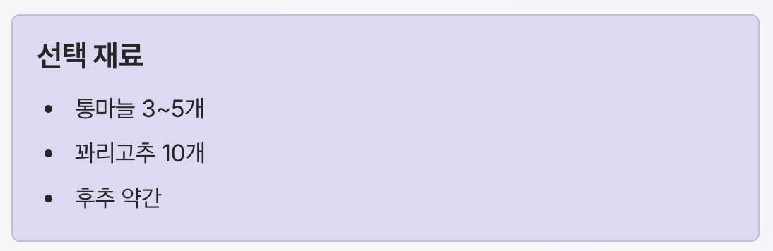 마지막에 꽈리고추나 통마늘을 넣으면 풍미가 훨씬 좋아집니다.