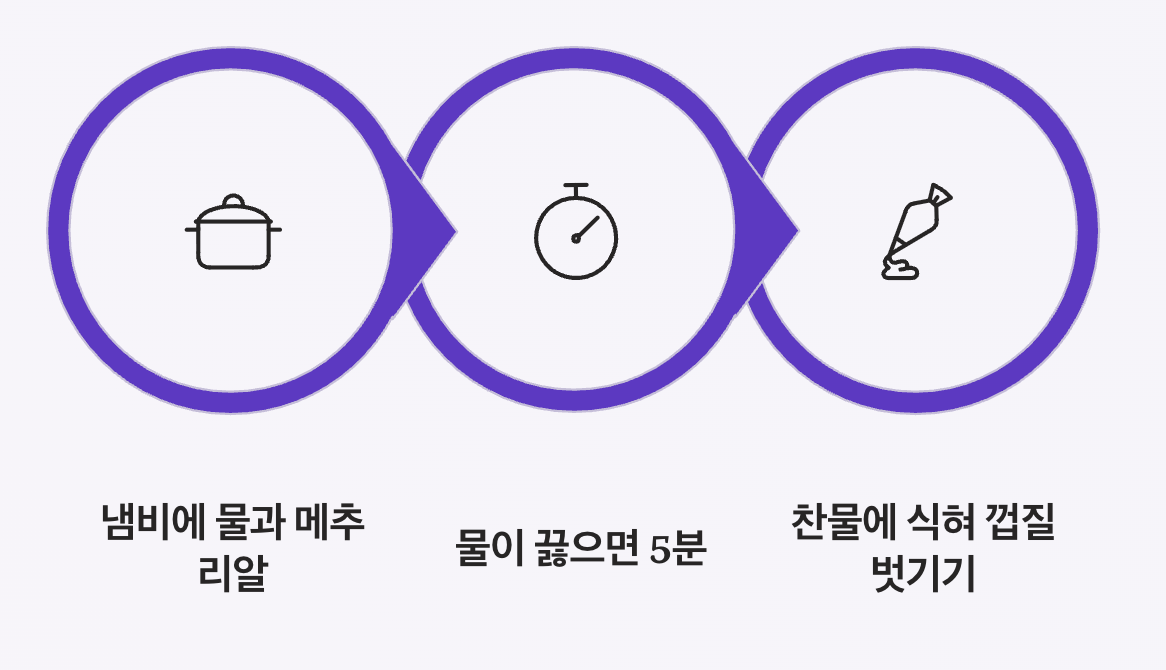 껍질이 잘 벗겨지도록 하려면 삶은 뒤 바로 찬물에 담가주는 것이 중요합니다.