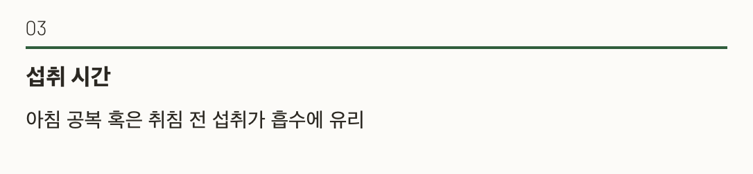 • 아침 공복 혹은 취침 전 섭취가 흡수에 유리