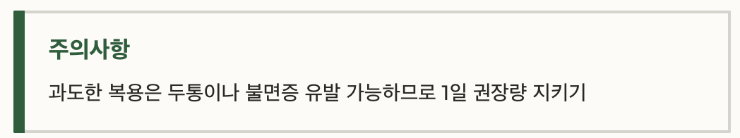 • 과도한 복용은 두통이나 불면증 유발 가능하므로 1일 권장량 지키기