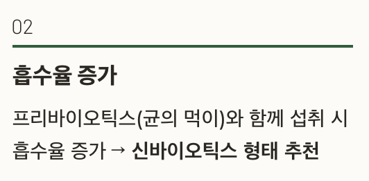 • 프리바이오틱스(균의 먹이)와 함께 섭취 시 흡수율 증가 → 신바이오틱스 형태 추천