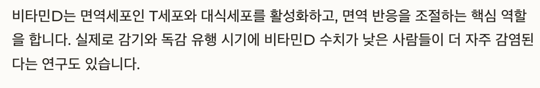 비타민D는 면역세포인 T세포와 대식세포를 활성화하고, 면역 반응을 조절하는 핵심 역할을 합니다.