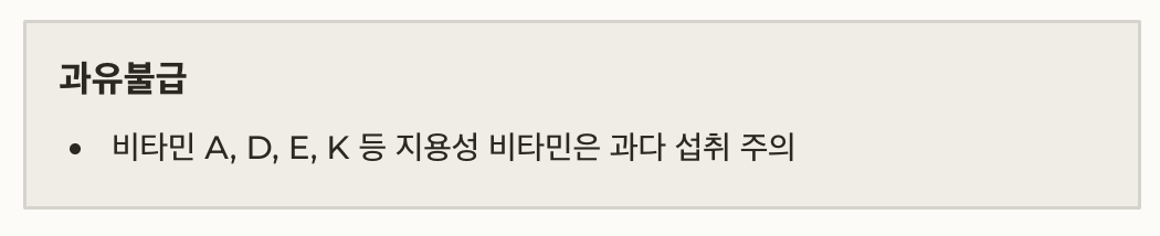 • 비타민 A, D, E, K 등 지용성 비타민은 과다 섭취 주의