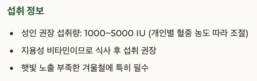 • 성인 권장 섭취량: 1000~5000 IU (개인별 혈중 농도 따라 조절)