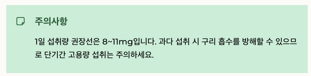 • 과다 섭취 시 구리 흡수를 방해할 수 있으므로 단기간 고용량 섭취는 주의